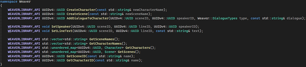 Weaver is a custom Dialogue Creator to be used for creating dialogue in games. It will support both branching and linear dialogue.